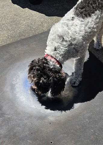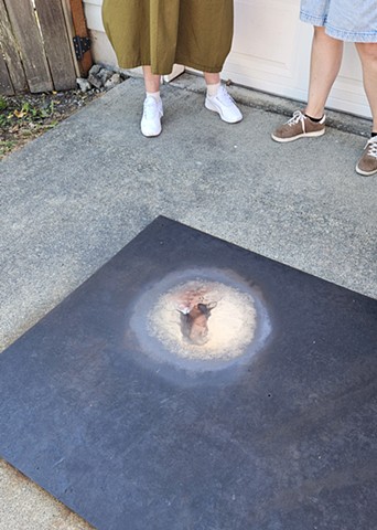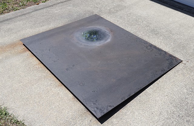 GLANCE was made by polishing a spot on a weathered steel platform to a mirror finish while thinking about reflecting ponds, Narcissus, phone screens, and the way the sky is reflected off oils pots in parking lots. The work asked viewers to look down to see up.
