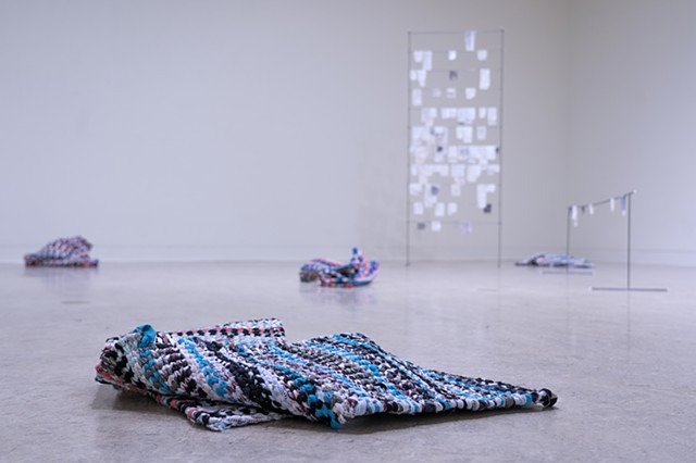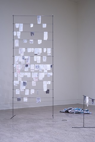 Along thin steel wires, washed out paper hangs like laundry. The dimensions are familiar, with crisp, uniform side edges and you can recall the sound of them slipping out from a narrow slot. Picture them sitting, crumpled, in the bottoms of my bags, in pockets, or littering junk drawers. Each paper is (was) a receipt, a record of exchange, a short story. Here they've been uncrumpled and their chemical coatings have been washed away along with the information they carried leaving them blankish paper.